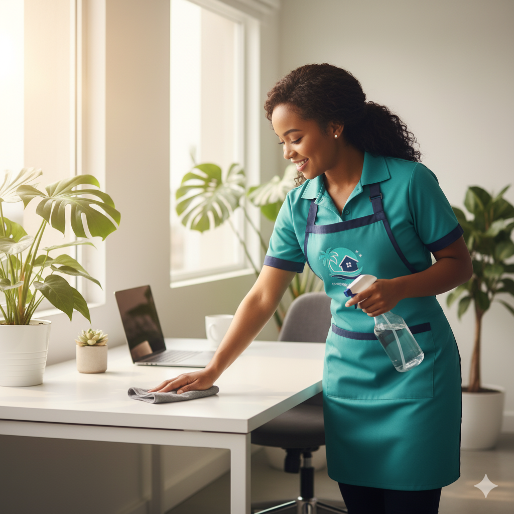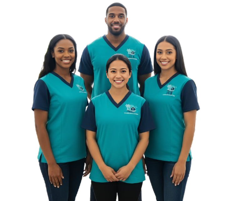 Every member of our team is uniformed, insured, and committed to delivering quality results with a smile. Whether you’re preparing your home for guests, managing a busy office, or just need help keeping up, we’re here to help — all while bringing a breeze of Caribbean calm to your space.